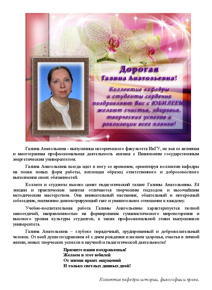 30 января 2026 г. отмечает юбилей замечательный человек, доктор исторических наук, профессор кафедры истории, философии и права Галина Анатольевна Будник.
