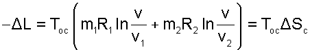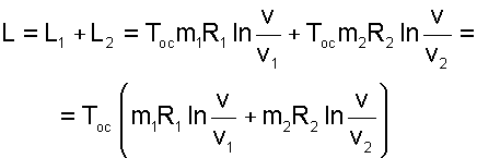 В соответствии с первым законом термодинамики для всей термодинамической системы эти работы должны быть равны теплоте, полученной каждым газом в обратимых процессах их теплообмена с окружающей средой при осуществлении процесса смешения, т.е. L1=Q1 и L2=Q2. Следовательно, внутренняя энергия каждого газа и всей системы в процессе смешения не изменится, а так как температуры газов одинаковы, то обратимый процесс диффузионного смешения газов будет изотермическим. Работу такого изотермического расширения газов можно рассчитать по формуле